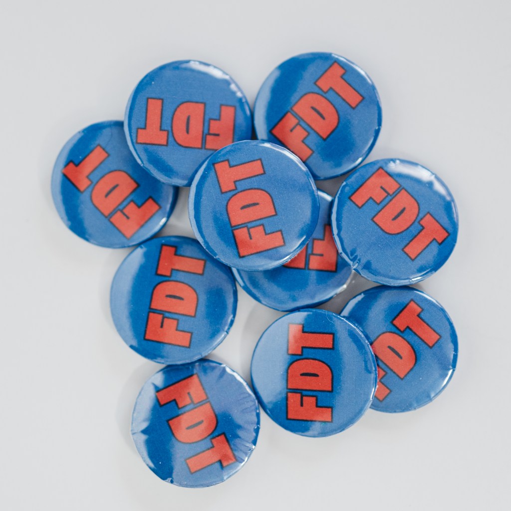 Say it loud, say it clear: FDT. This handmade 1.25″ metal button gets straight to the point. Bold, durable, and ready to be worn on jackets, bags, hats—anywhere you want to make a statement.